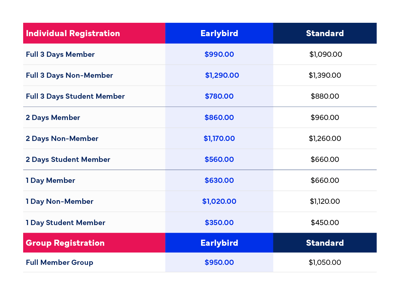 Standard rates are listed below. For full registration information, please refer to the registration page on the website. Please select your applicable registration type, days and member status. 1 registration per peron. NB: Member includes current financial members from ESSA, ACSM, CASES, CEPA, CSEP and SESNZ.